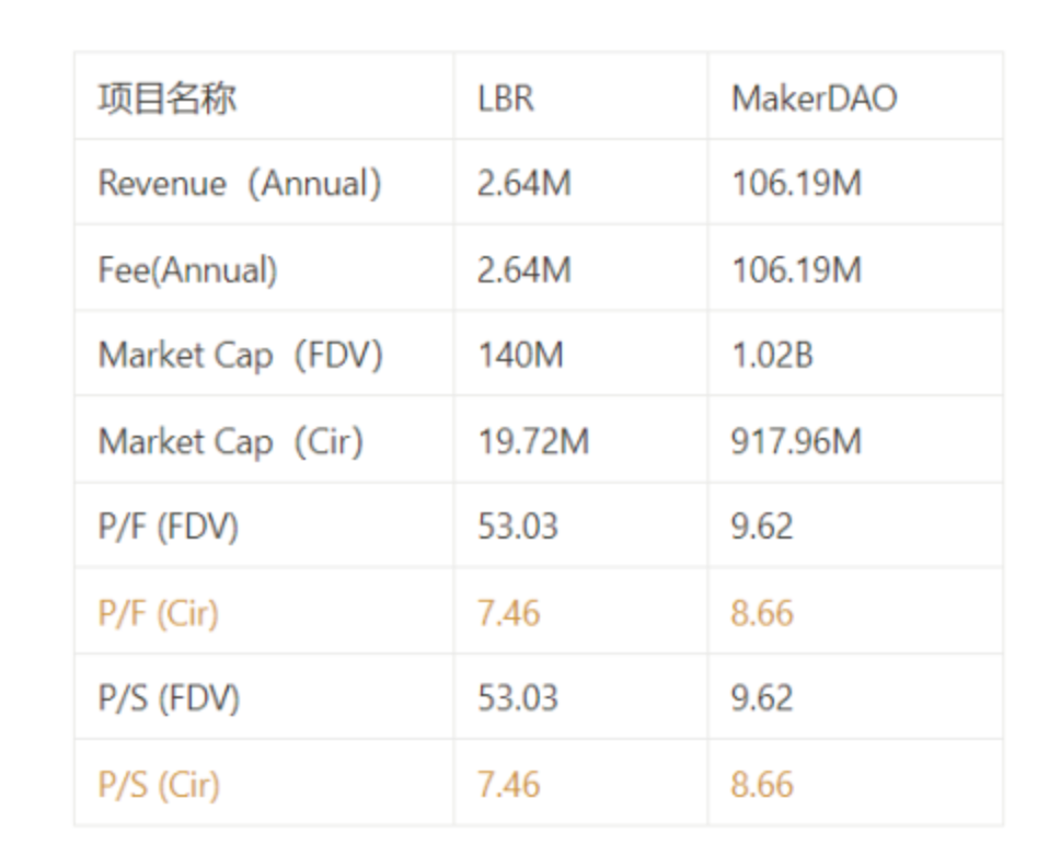 从估值的对比可得 Lybra 的 FDV 估值明显远大于 MakerDao,而以流通市值作比较的话 LBR 在当前时间相较 Makerdao 会低一些。