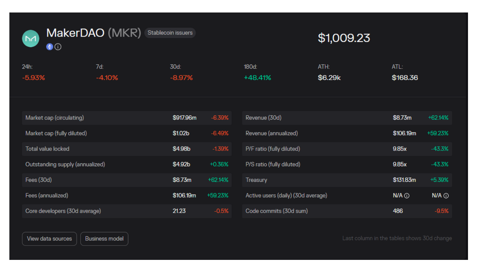 在去中心化稳定币方面 Makerdao 为绝对龙头,以 MakerDao 的 TokenTerminal 数据进行对比 ,MakerDao 当前流通市值 917.96M, FDV1.02B;Fee 和 Revenue 数据为 106M(近一个月的收入乘以 12 进行估算)