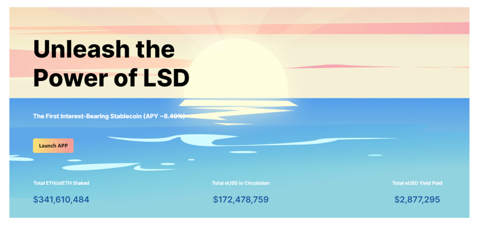 eUSD 为生息稳定币,根据上图的数据,官网的 eUSD 利率为 8.40%;笔者尝试估算参与铸造的用户获得的收益:实际计算当前全局抵押率为 198%,当日 Lido 的 stETH 利率约为 4%,扣去 1.5% 的协议年化费用(按照 eUSD 规模扣除,因此前面的总数直接减去 1.5%),按照全局抵押率质押的用户获得的收益约为 6.42%,与官方给出的数据有一定差距。