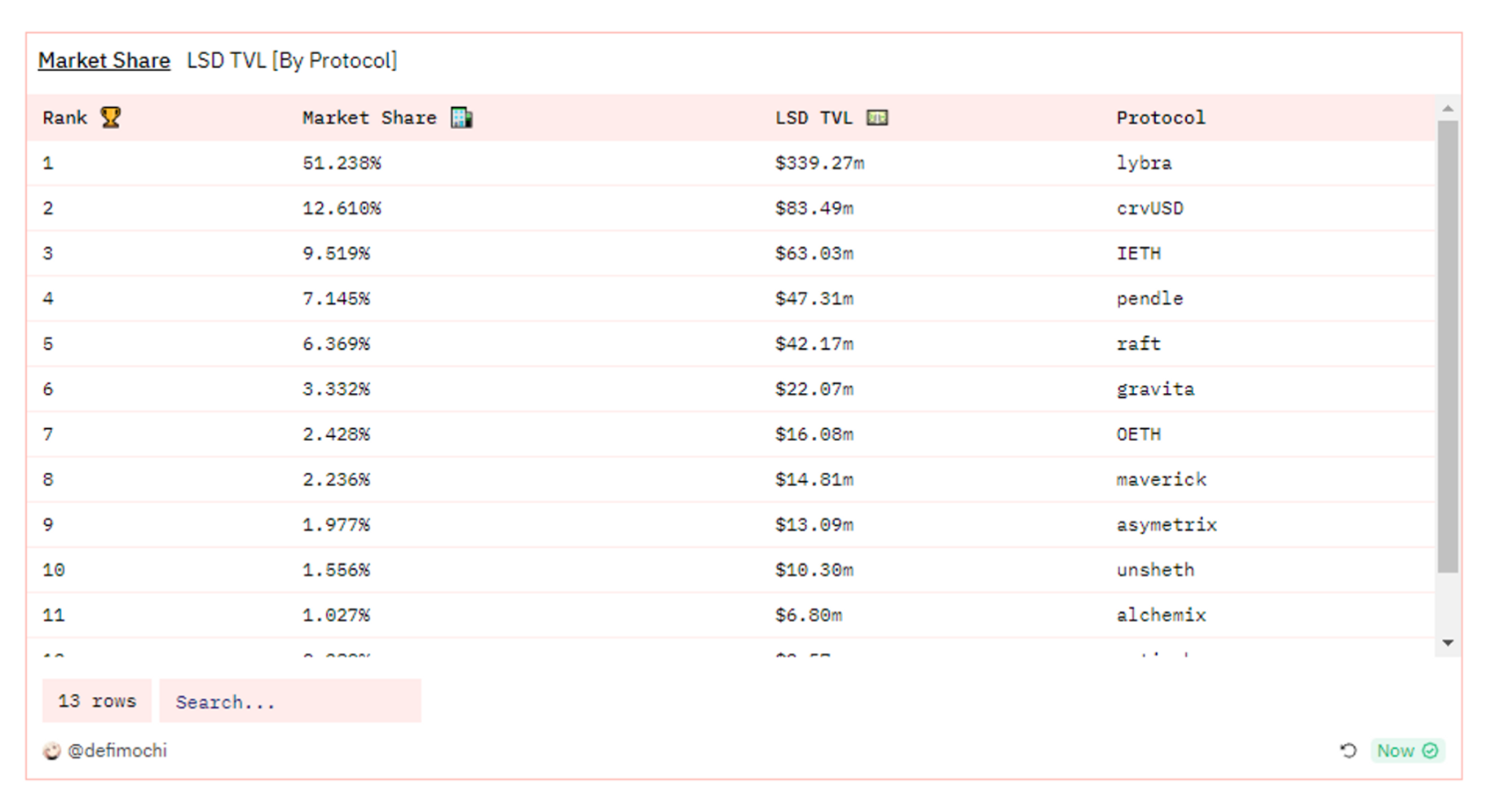 根据 Defimochi 的 dune 数据,当前 LSDFI 赛道的体量并不算大,约在 6.6 亿左右,而 Lybra 在 LSDFI 的市场中占比 51.2%,是绝对的先发头部项目。