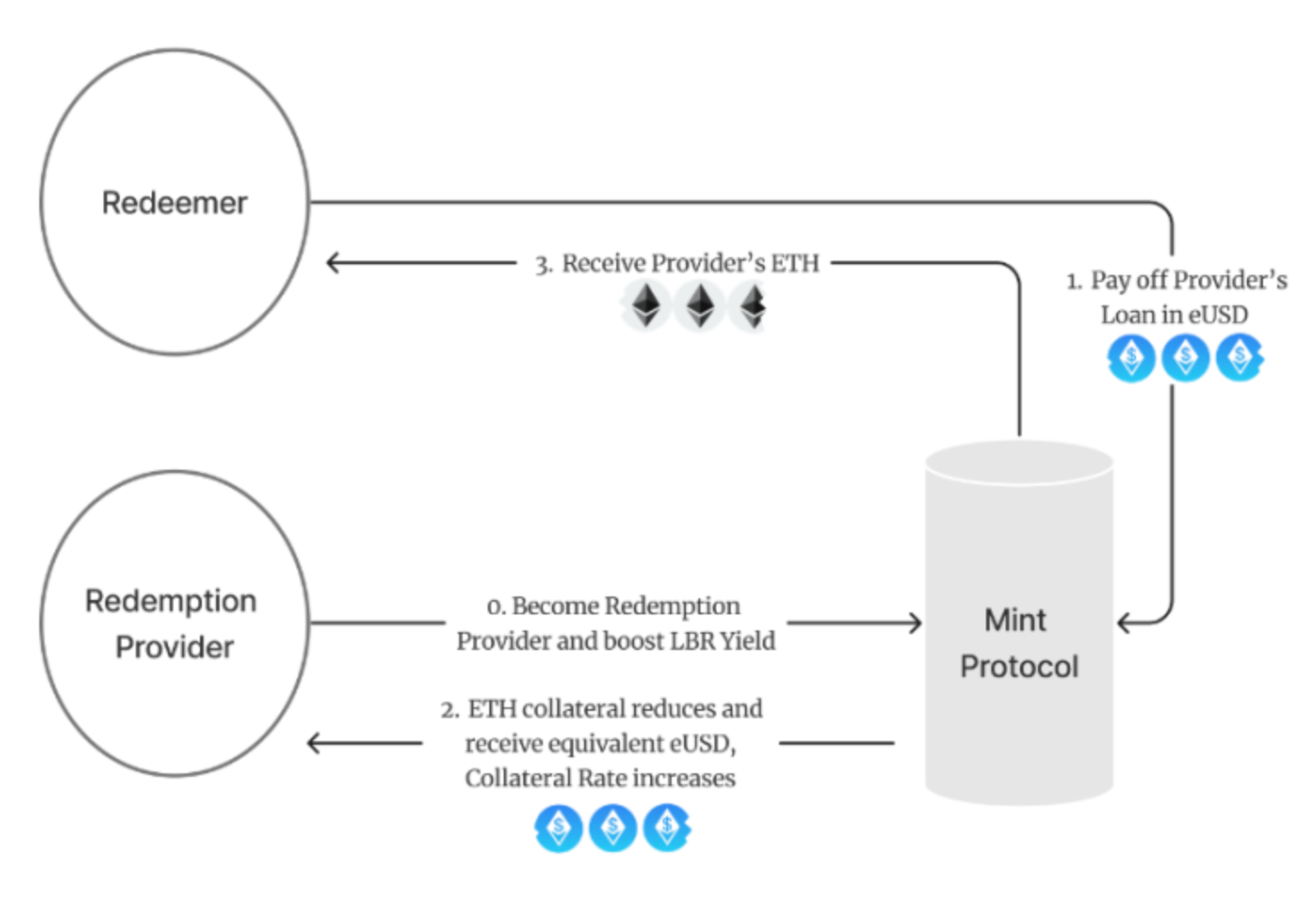 eUSD 的价值会因市场交易而上下波动,当 eUSD 的价格较低且低于 0.995 时,协议会提供扣款 0.5% 的刚性赎回的服务,即用户可以选择刚性赎回业务将 eUSD 按照 1:0.995 进行刚性赎回换回 ETH,从而让 eUSD 的价格不会继续脱锚。