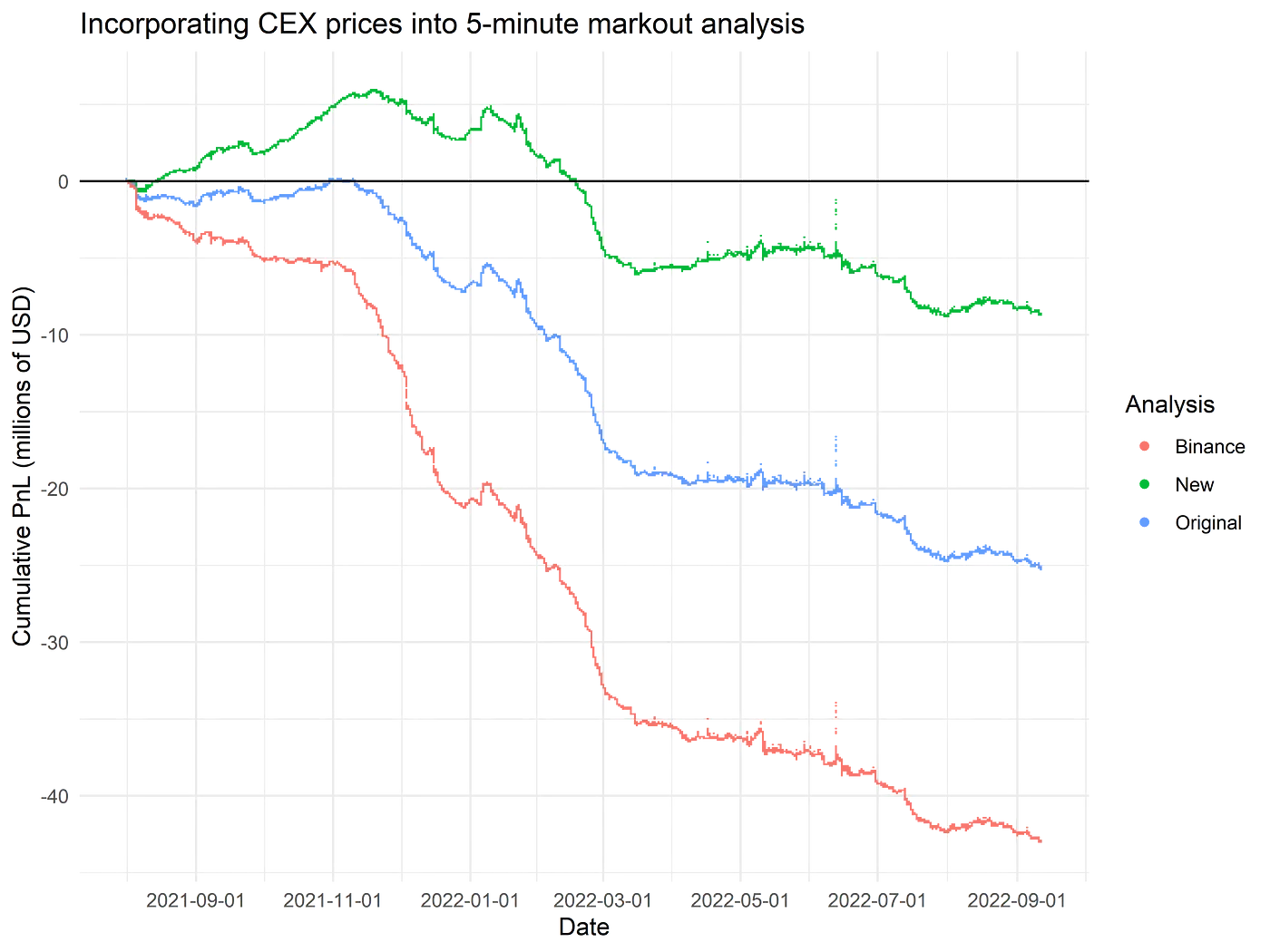 LVR 取决于发现价格的位置:重要的是你卖给套利交易者的价格比当前加权平均市场价格差多少。