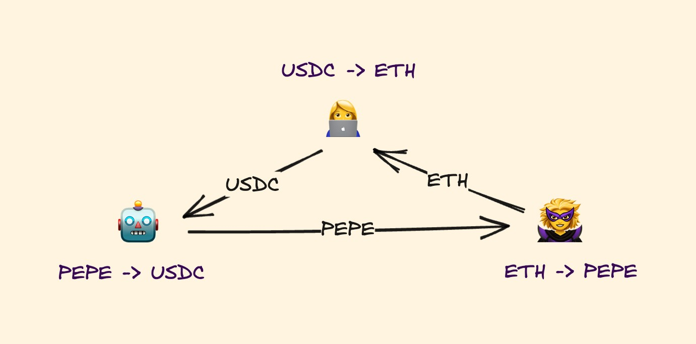三个交易者之间的需求匹配 (CoW) 交易示例。每个人都进行他们想要的交换,为彼此提供流动性——无需通过 DEX 路由或支付 DEX 费用。