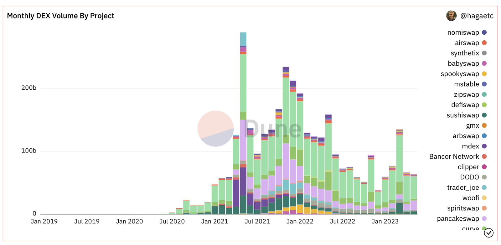 DEX 仍仅占加密货币交易量的 15% 左右,但其份额正在增长。资料来源:Coingecko 2023 年第一季度行业报告