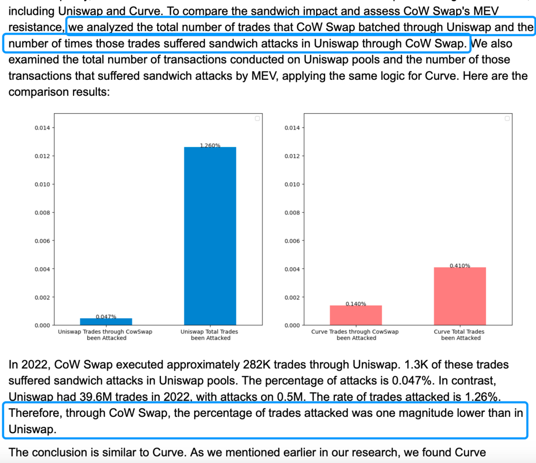 对比在 Uniswap 和 Curve 上发生的三明治攻击,通过 CoWSwap 路由受到攻击的交易数量大大减少;对比 1inch 和 matcha,CoWSwap 在 2022年有最少的三明治攻击次数和最低的交易量比例。