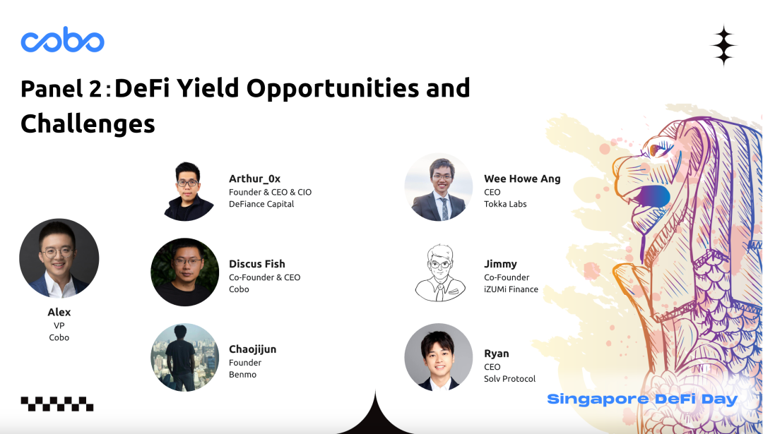 以上这些内容摘录自 9 月11日由 Cobo 主办、NEO 协办的 「Singapore DeFi Day 」一次实战高手云集的圆桌分享,Cobo 联合创始人兼 CEO 神鱼、 DeFiance Capital CEO Arthur , Benmo 社区创始人超级君,Tokka Labs CEO Wee Howe Ang,iZUMi Finance 联合创始人 Jimmy 和 Solv Protocol CEO Ryan 等多位一线行业大佬和 DeFi 专家,围绕「DeFi 的收益机会与挑战」产生了高质量的讨论和对话,话题涉及去年一年中大家的基础收益和超额收益来源,在各自领域碰到了哪些风险,有哪些新的令人兴奋的趋势等。