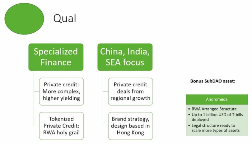 - Qual 是也一个专注于 RWA 和金融的 SubDAO,例如更复杂、规模更小的私人信贷,但收益率更高。Qual 更多的是面向中国加密社区和东南亚社区。