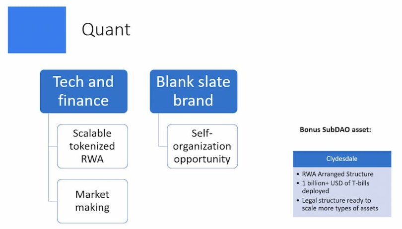 - Quant 是专注于现实世界资产(RWA)的 SubDAO,利用技术和规模来创造价值,将 Maker 的数十亿规模与代币化资产相结合。