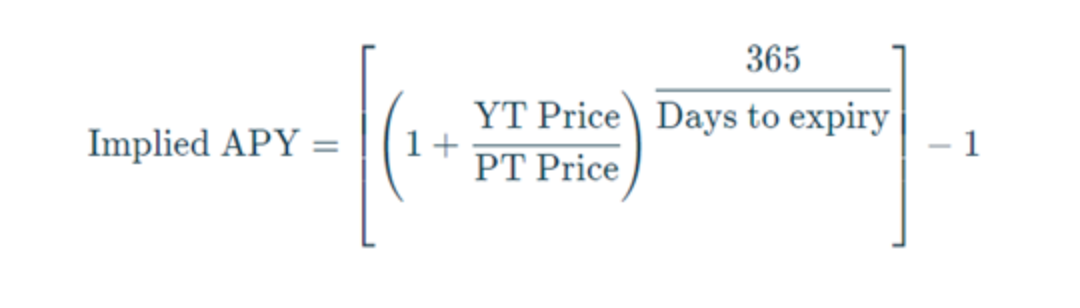 l Implied APY:隐含年化收益率,或简称「隐含 APY」,是市场对于资产未来 APY 的共识。该值基于 YT 和 PT 价格比率计算得出,公式如下所示。