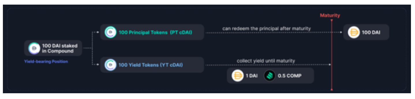 其中,每一个本金代币 PT-CDAI 在到期后,都可以兑换一个 DAI: 每一个 YT-DAI,可以兑换在持有期间的 CDAI 收益。
