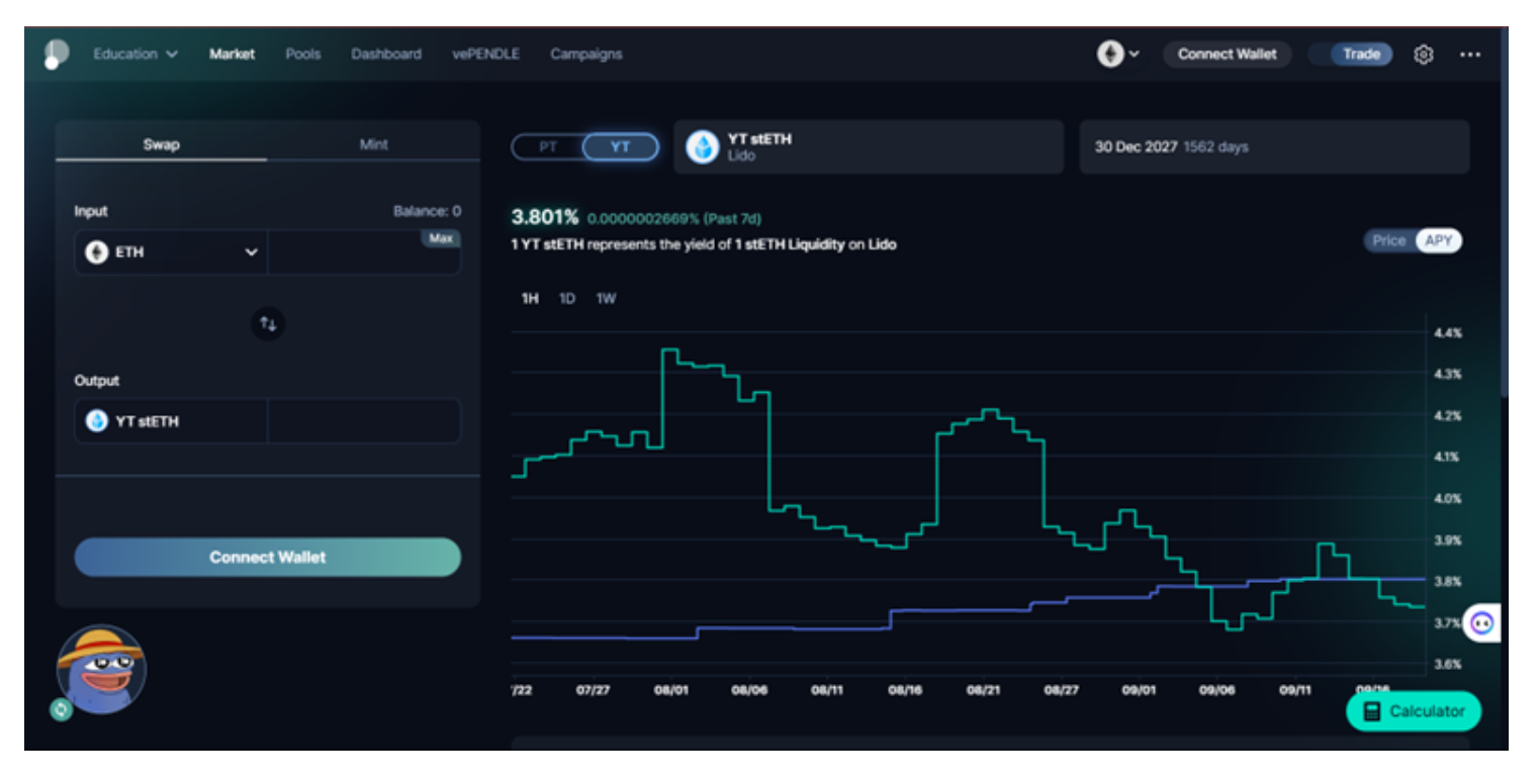 Pendle 有两个不同的界面,一个简单的 Earn 界面和一个专业的 Trade 界面。