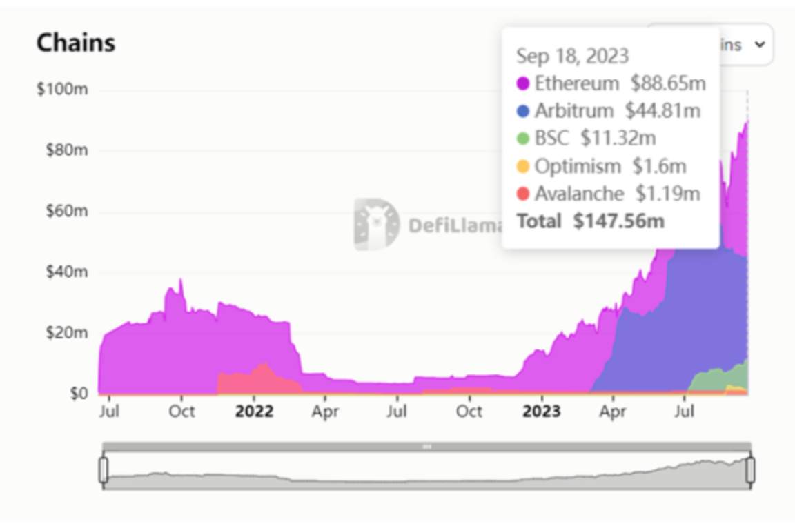 2021 年 6 月,Pendle 主网在以太坊上线来,Pendle 经过了 V1、V2 的迭代,现在成为了 LSDFi 市场的顶级协议。2023 年以来,Pendle 锁仓量从 16M 美金来到了现在(2023/9/15)145M 美金,增长接近十倍,并且由于其代币上线币安,获得了较多关注。