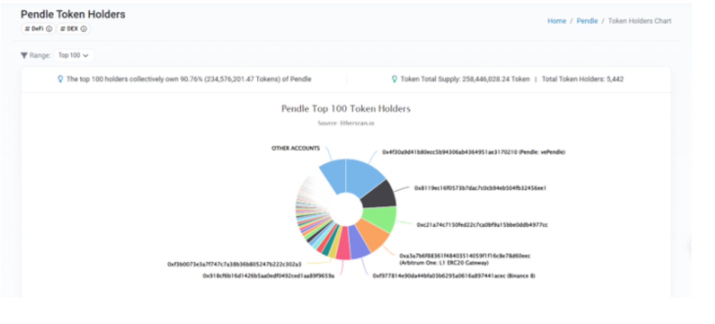 根据 Etherscan 的数据显示,截至 2023 年 9 月 20 日,$pendle 共有 5442 个持币地址,前一百地址持仓占比 90.76%,前十地址持仓占比 61.92%。
