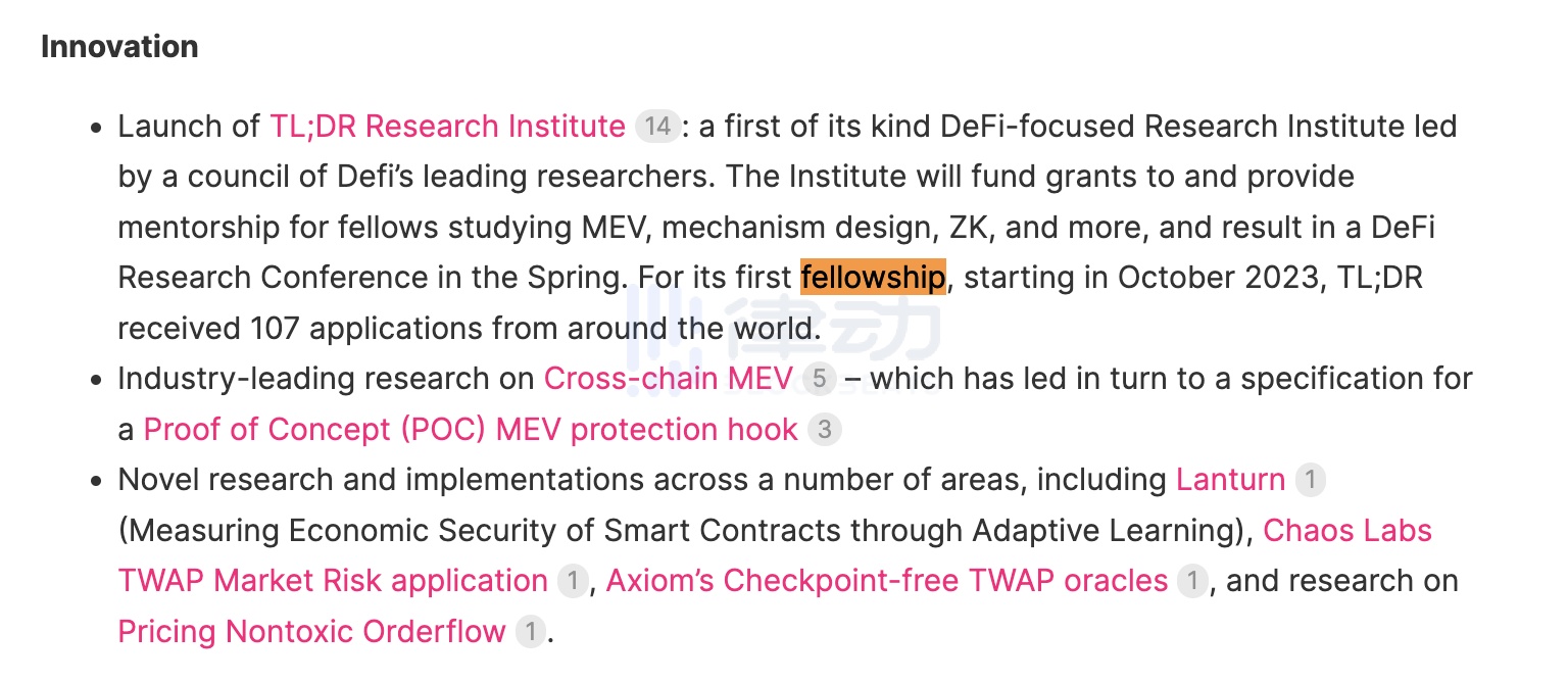 根据昨日的 Uniswap 基金会资金筹措计划显示,这笔资金的用途之一是在 2023 年 10 月推出 Fellowship 计划,并创建工作组,将 MEV 和其他相关领域的前沿研究直接应用于 Uniswap。