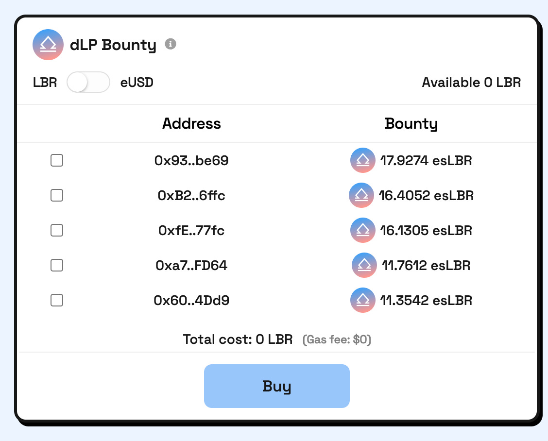 - dLP Token销毁机制:如果想要从 $eUSD 池子中获得 $esLBR 的排放,LP提供者必须锁定超过其贷款总价值2.5%价值的 LBR/ETH dLP。当小于2.5%时,其他用户可以以40%的折扣,用 $LBR 和 $eUSD 购买这些无人认领的 $esLBR 排放。用于购买 $esLBR 的 $LBR 将会被Burn掉。