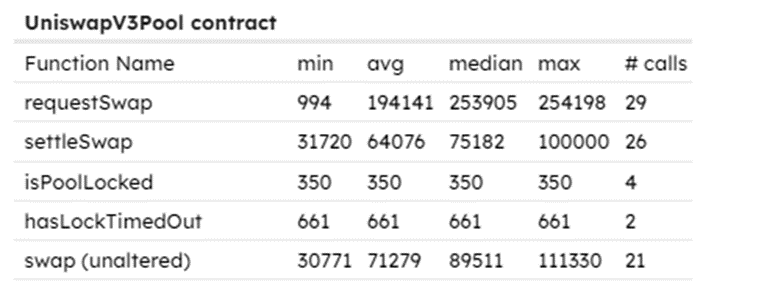 zkVM中的程序大约需要~154720个周期。requestSwap消耗的平均gas量为~194141(最差的~254198),setteSwap消耗的平均gas量为~64076(最差的~100000)。作为参考,一个未修改的swap调用使用大约~71279(最差的~111330) gas。requestSwap可以得到显著的优化,但这里的情况并非如此,因为Bonsai请求最终比swap更昂贵。