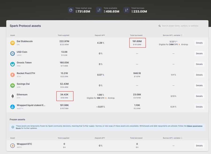 而这次盲挖,给 $ETH 存池6M枚SPK, $DAI 贷池24M枚SPK,也就是第一年发行量的5%,总量的1.15%。