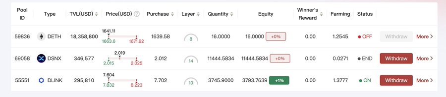 Last Layer Reward: 在 V2 中加入,是为了进一步鼓励用户在下跌时加入 Pool 的最后一层抄底。 在池子盈利退出时,最后一层抄底的所有用户会优先获得一个保底利润。 然后池子才会计算整体利润对份数的平均利润,分给所有的参与者。