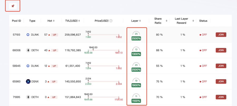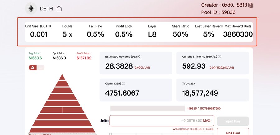Double:指每一层的倍增关系。比如第一层加入了 10 份池子,Double 是 5,那么第二层最多就可以存入 5*10 = 50 份池子,依次类推。