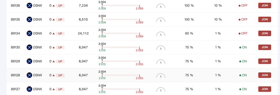 在“Pool Market” 下可以找到 pool 的列表,UI 可以根据资产类型和池子 ID 筛选池子。 只有状态“Status”为“ON”的池子才能加入,“OFF”的池子需要等待代币价格进一步下跌后才能加入。