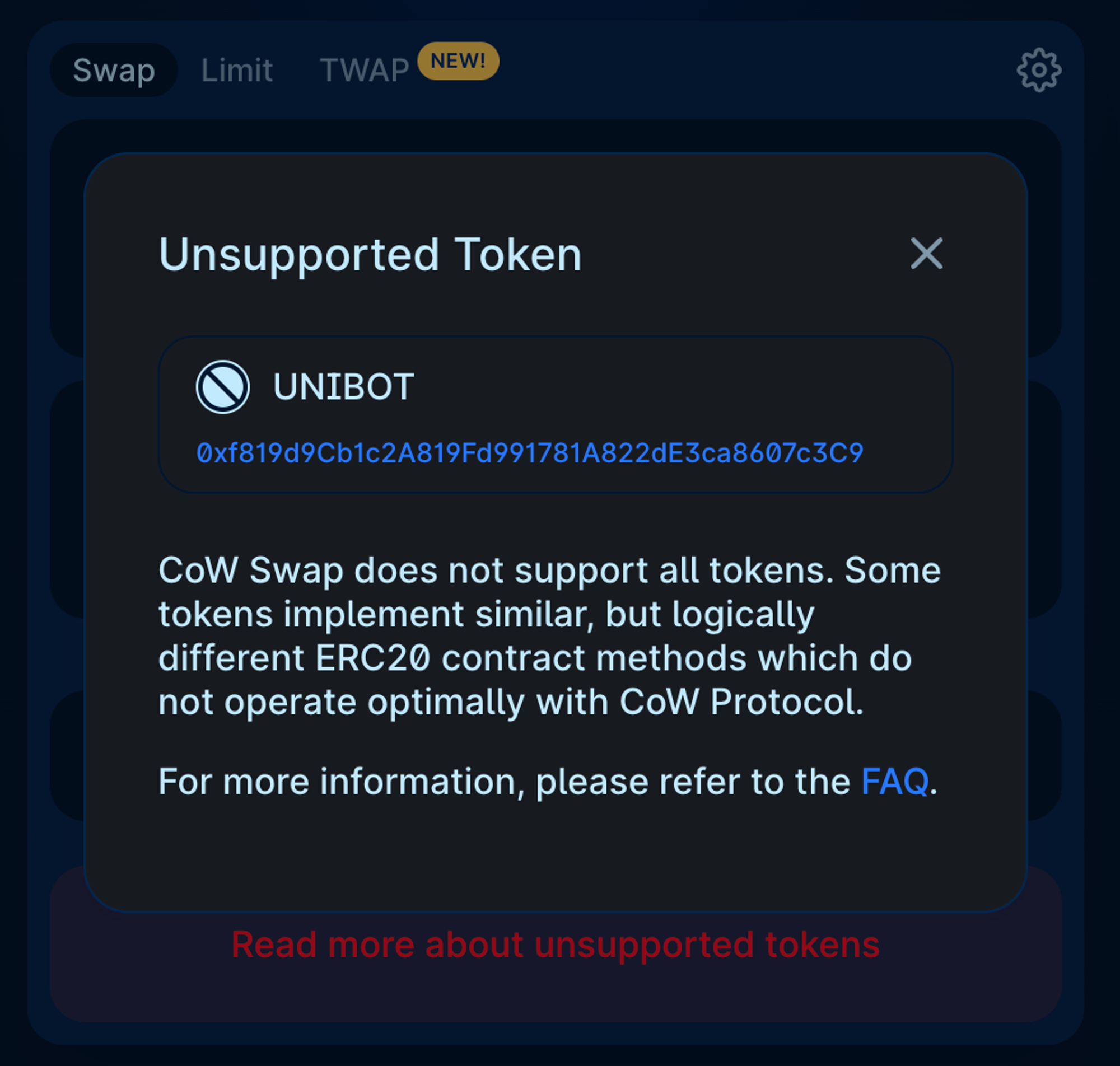 CoW Swap 目前并不支持所有代币的交换,只支持符合 ERC-20 标准的代币。而且,有些代币虽然实现了典型的 ERC20 接口,但在调用传输和传输从方法时,接收方将获得的实际金额将小于指定的发送量。这会导致 CoW Swap 的结算逻辑出现问题,如 $Unibot 就不支持在 CoW Swap 交易。不过,根据其团队的说法,支持的代币会很快逐步扩大。