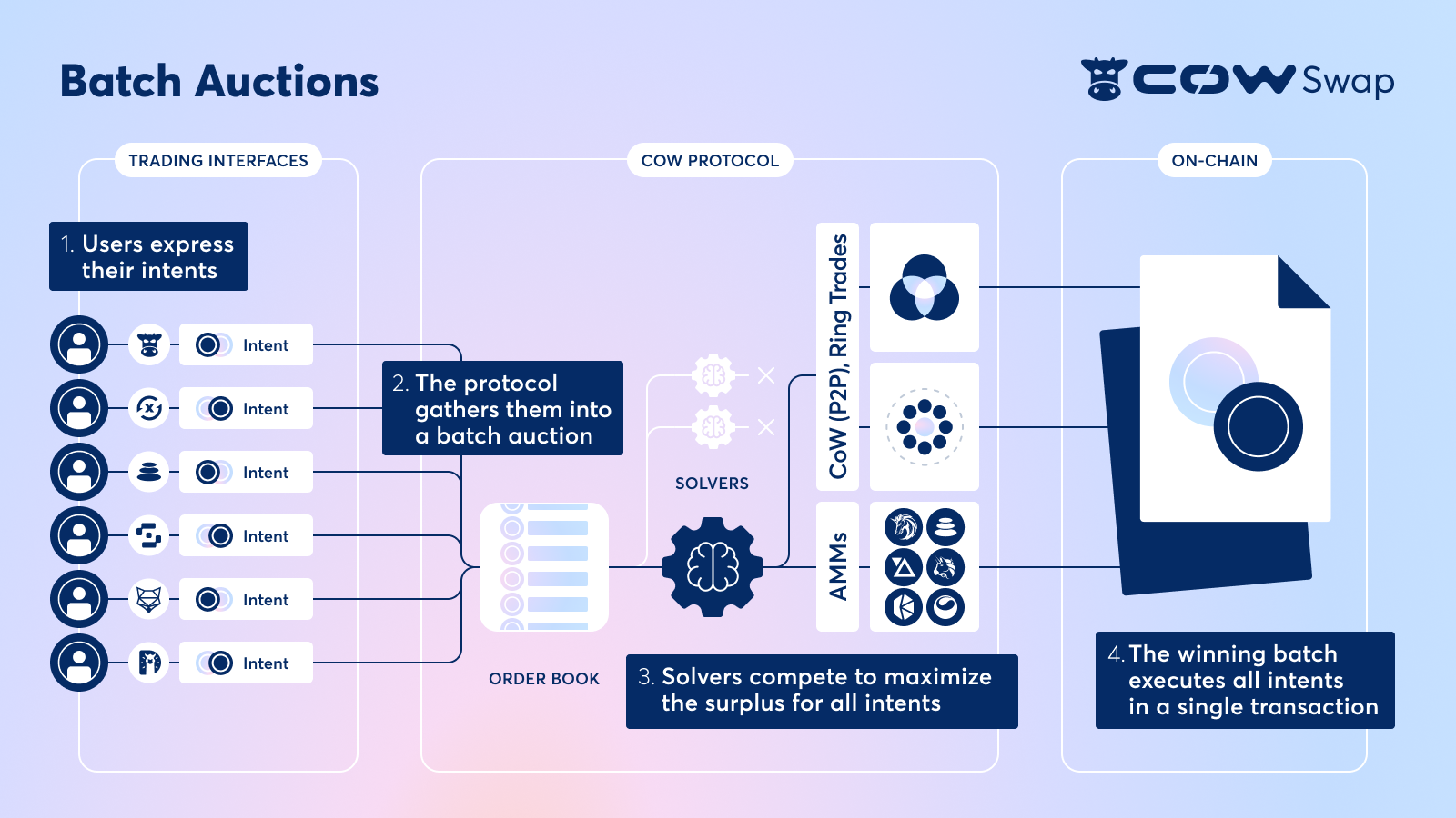- CoW Swap:所有 solvers 将其解决方案提交给 Driver 进行排名。一旦竞标期结束,即所有解决方案都已提交并排名,排名最高的解决方案会收到执行通知。通过批量拍卖,CoW Swap 可以在一个交易中结算多个订单。