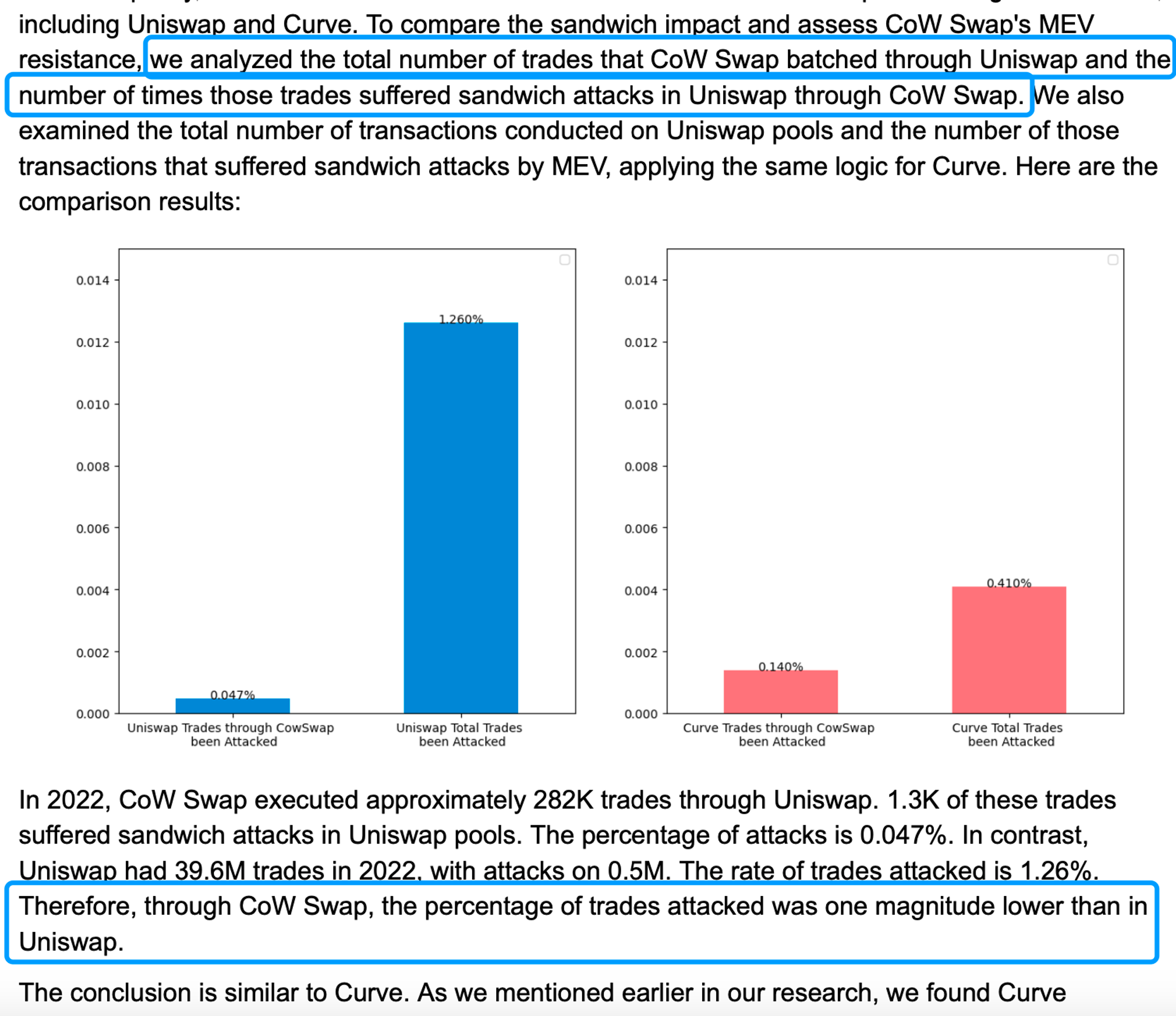 对比在 Uniswap 和 Curve 上发生的三明治攻击,通过 CoW Swap 路由受到攻击的交易数量大大减少;对比 1inch 和 matcha,CoW Swap 在 2022 年有最少的三明治攻击次数和最低的交易量比例。