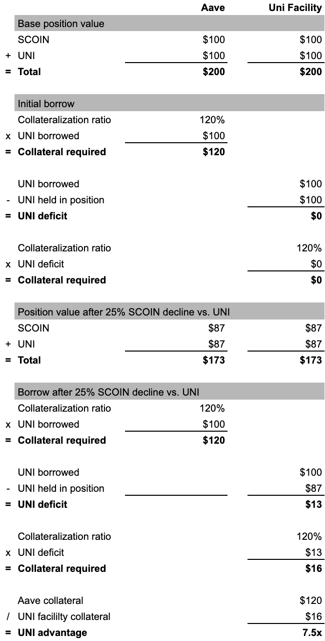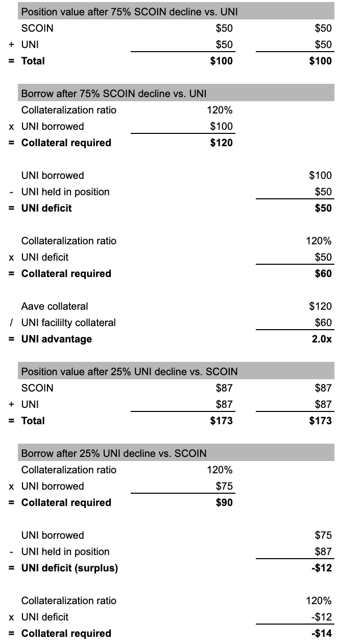 UNI 信贷机制(UCF)是一种允许 LP 借入 UNI 以获得流动性头寸的机制。在任何情况下,它的资本效率都比 Aave 更高,从 1 倍到无限高不等。它不需要任何前期资本,因为借款人只需要在配对代币对UNI贬值时抵押其头寸的赤字。