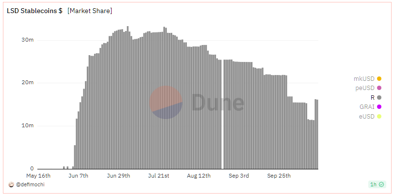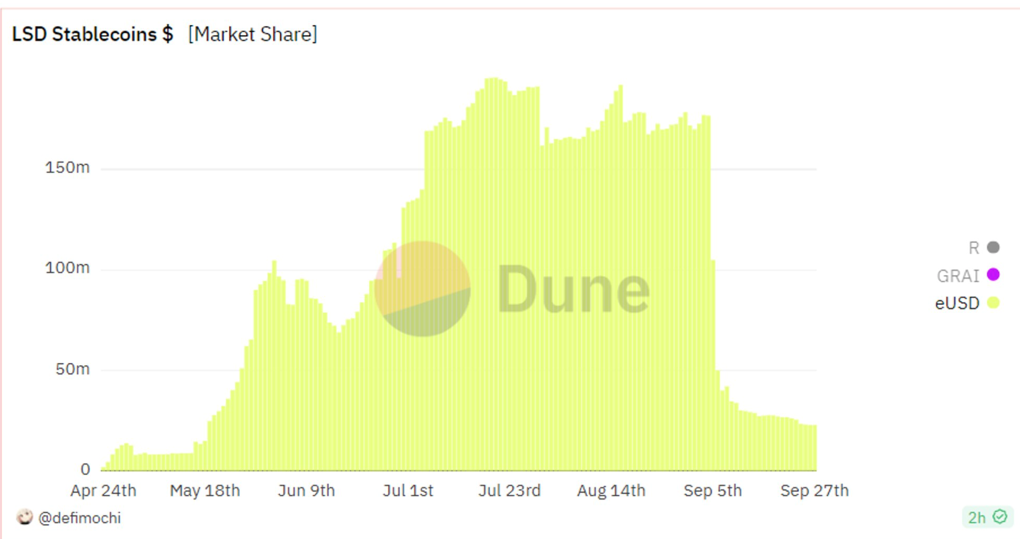 - mkUSD 稳定币市值接近 3000 万美元,是该细分市场的头号竞争对手。