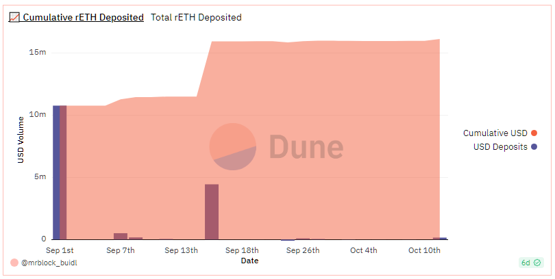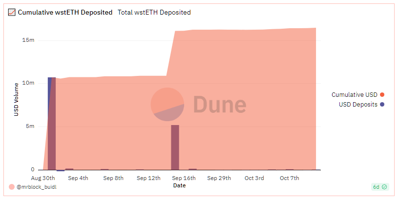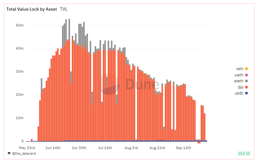 TVL 持续上升,目前处于历史最高水平,达3400 万美元(其中 rETH 占 1340 万美元,wstETH 占 770 万美元)。