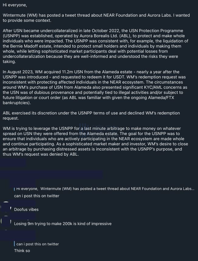 Illia 表明,Wintermute 正试图利用 USNPP 进行最后一刻套利,以从 Alameda estate 提供的 USN 价差中获利。USNPP 的目标是确保积极参与 NEAR 生态系统的个人得到全额补偿并继续参与。作为一位老练的做市商和投资者,Wintermute 通过购买不良资产来结束套利的愿望与 USNPP 的目的不一致,因此 ABL 拒绝了 Wintermute 的要求。