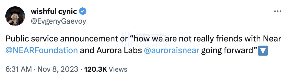 「NEAR 将我们介绍给 Aurora,Aurora 在私下聊天中确认他们可以在几天内为我们的具体情况提供便利。他们拒绝按照其公开和私人承诺将我们的 USN 转换为 USDT,这对我们造成了直接伤害」,Gaevoy表示。