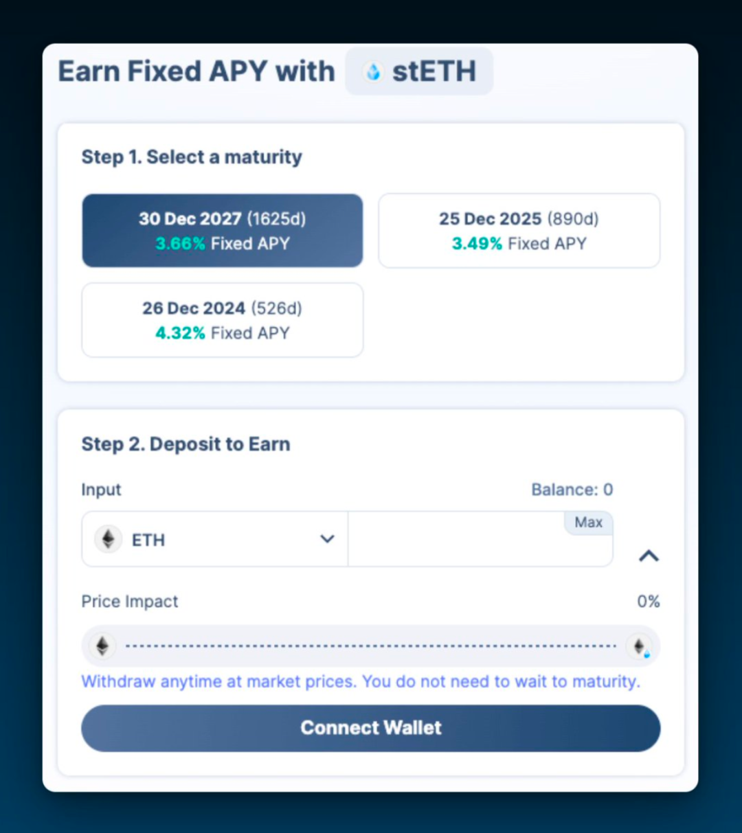23年7月,Pendle 推出了 Pendle Earn,用 APY 替代了之前折扣资产的叙事。它的前端看起来如同中心化交易所的理财产品,不同之处在于它是在链上构建,其提供的固定收益产品的利率和期限都由智能合约约定,相对透明,是一个差异化的补充。用户无需理解利率交易相关的复杂概念,只需选择符合自己预期收益的产品。