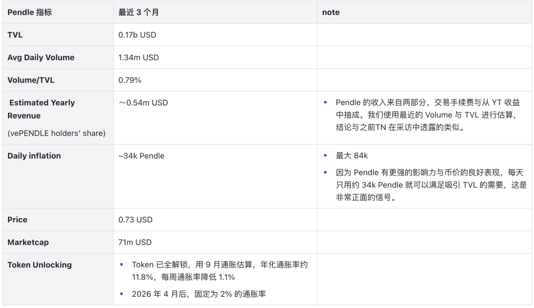 - Pendle 用于流动性激励的代币通胀可以看做协议的支出。目前 Pendle 每日支出约 34k Pendle,而日收入约 $1.5k,从这个角度来看 Pendle 并未 PMF、远不能盈利,但是 Pendle 的费用结构当前并未最终确定,当协议发展进入成熟期后,可能会设定新的、更合理费用结构。