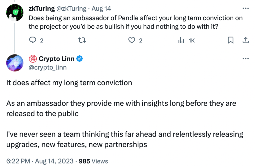 Twitter 作为触达 Web3 深度用户的主阵地,Pendle 自然没有错过。不过,虽然内容策略是每个 DeFi 协议的标配,Pendle 仍然在这块做出了自己的特色。Pendle 目前官宣的大使包括 @crypto_linn,@ViNc2453(中文区),@Neoo_Nav(越南)。难能可贵的是每位大使都对 Pendle 有深度认同,而不仅仅是简单恰饭 :) 以 crypto linn 为例,她曾多次在文中毫不掩饰表达其对 Pendle 及其团队的欣赏: