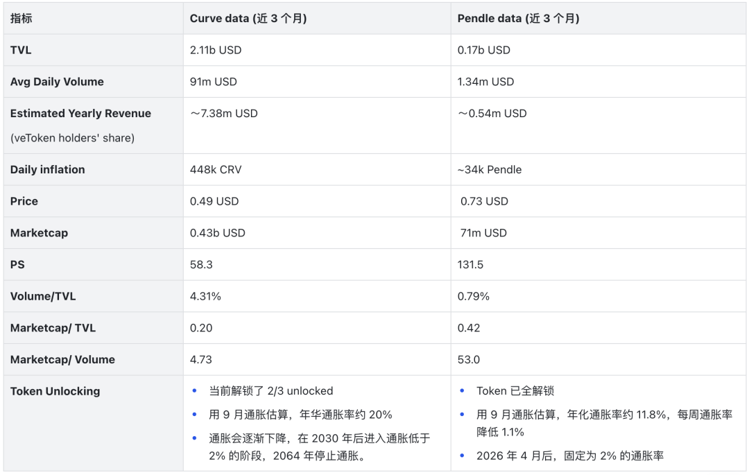 Curve 的 Volume/TVL 是 4.31% ,比 Pendle 的情况好很多;每日支出 448K CRV,日收入约为 $20k,显然 Curve 也没能做到收支平衡。不过对比两者 PS,当前 Pendle 131.5,Curve 为 58.3,除了 PS 外,更适合 DeFi 项目的指标有 Marketcap/TVL 与 Marketcap/Volume,Pendle 分别是 0.42 与 53.0,Curve 分别是 0.20 与 4.73,高倍率一定程度代表市场对 Pendle 未来高增速的预期。这也很符合 Crypto 市场的特点,我们鼓励创造 Pattern 的人,创新项目值得更高的估值 :)