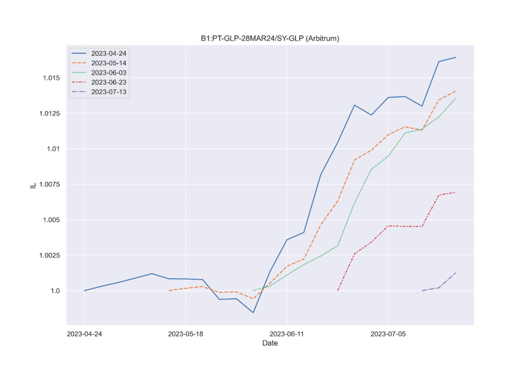 - 因 PT 的特点 —— 价格与底层资产之间有相关性,在底层资产价格一定的负溢价区间内波动。PT 在 Maturity 后价格与底层资产相等,所以为 PT-SY 提供流动性的无常损失较小。Pendle 团队在推特发布过一些流动池的 IL 回测:在最差的情况下,IL 是 0.85%,依然非常低。这类无常损失较低的流动性池一直是 DeFi 世界里流动性提供者最热爱的标的,他们用币本位衡量损益,愿意接受浮动的收益率,以及愿意相对深入地使用协议。