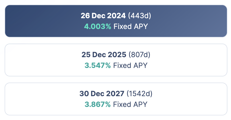 - 不同 Maturity 的 PT,会有独立的 PT-SY 流动性池,因为 PT 面临的久期风险不同,所以会有不同的价格,也就代表着不同 Maturity 下的不同隐含收益率。