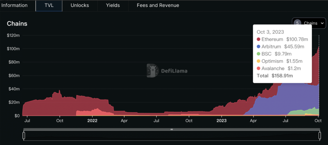 23年3月,Pendle 正式引入了 GLP(GMX v1 的 LP Token),进入了 Arbitrum 生态。GLP 在 Arbitrum 生态是非常受欢迎的资产,主要由一揽子蓝筹加密货币组成,同时提供 5% 到 20% 的 ETH 本位收益率。上半年 GLP 体量在高位仍保持了一定的增长,巅峰时期其供应量超过 550 M,其生息资产的特性非常适合 Pendle。