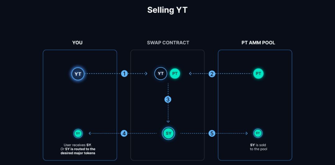 - 以向 SY-PT 的 LP 池卖出 10 YT 的过程为例:先虚拟出 10 PT,与 10 YT 合成为 10 SY,再将 9 SY Swap 为 10 PT 销毁(假设此时 PT=0.9 SY),剩余的 1 SY 即为 10 YT 卖出的结果。