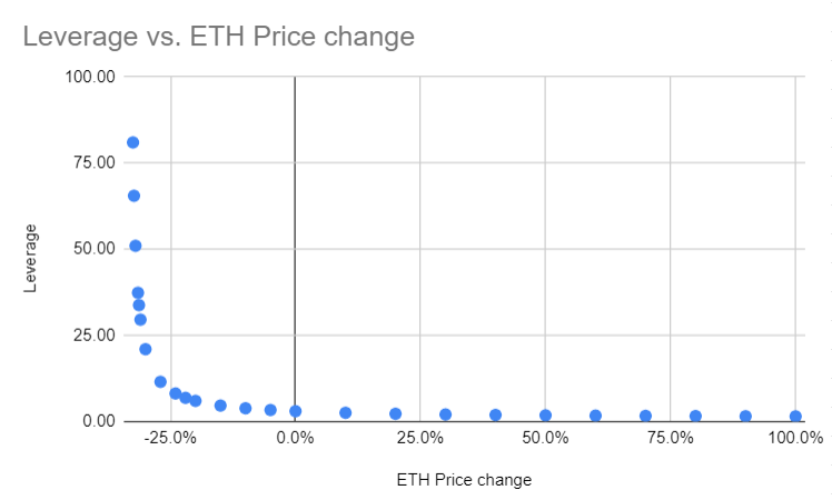 因此,尽管你可能认为通过进行固定的 3 倍保证金交易,可以保持不变的杠杆,但实时的杠杆是不断变化的。请查看下图,了解根据价格变动杠杆将会如何变化[1]。