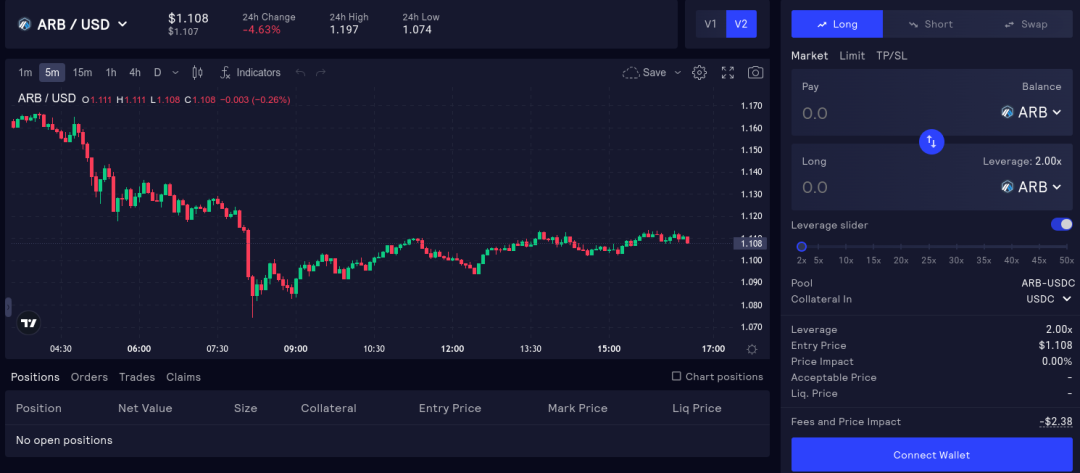 在此过程中,交易者支付交易费、开仓/平仓费和借入费,以换取对美元做多/做空指定代币(BTC、ETH、AVAX、UNI 和 LINK)的上行空间。