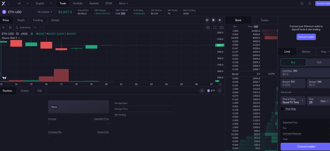 dYdX[4] 是一个去中心化交易所(DEX),赋予用户在完全掌控资产的同时高效交易永续合约的能力。自 2021 年上线以来,dYdX V3 采用了独特的非托管第二层扩展解决方案来实现其交易所,但其订单簿和撮合引擎仍然由中心化管理。