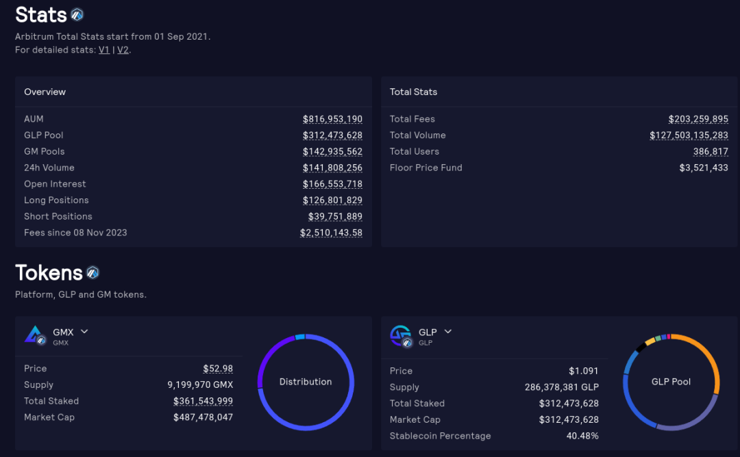 GMX[2] 是一个去中心化的现货和永续交易所,为交易者提供高达 50 倍杠杆的资产交易能力。该协议目前在 Arbitrum 和 Avalanche 上运行。在 GMX 上,交易者完全了解对手方的情况,这与在 CEX 上交易完全不同。GMX 与其他永续合约协议如 dYdX 不同,它完全在链上运作,并使用 AMM 功能来实现杠杆交易。