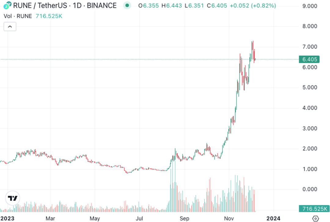 相较于 BTC 生态的蓬勃发展,AI 赛道的突然爆火,以太坊 Defi 项目在这一轮行情上涨中似乎显得乏力,但却有一个产品不断暗自发力,在 2023 最后一个季度上涨了超过四倍,从年度最低点上涨了更是超过六倍,在熊市中持续交付产品不断更新,那就是现在市场上 Defi 最靓的仔 - 跨链 DEX 协议 Thorchain。
