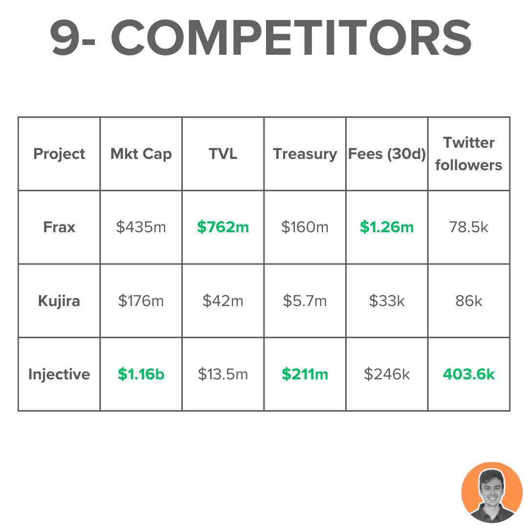 Kujira 最接近的竞争对手 Frax 和 Injective 也在开发一套由 DEX、稳定币和订单簿组成的 DeFi 产品。