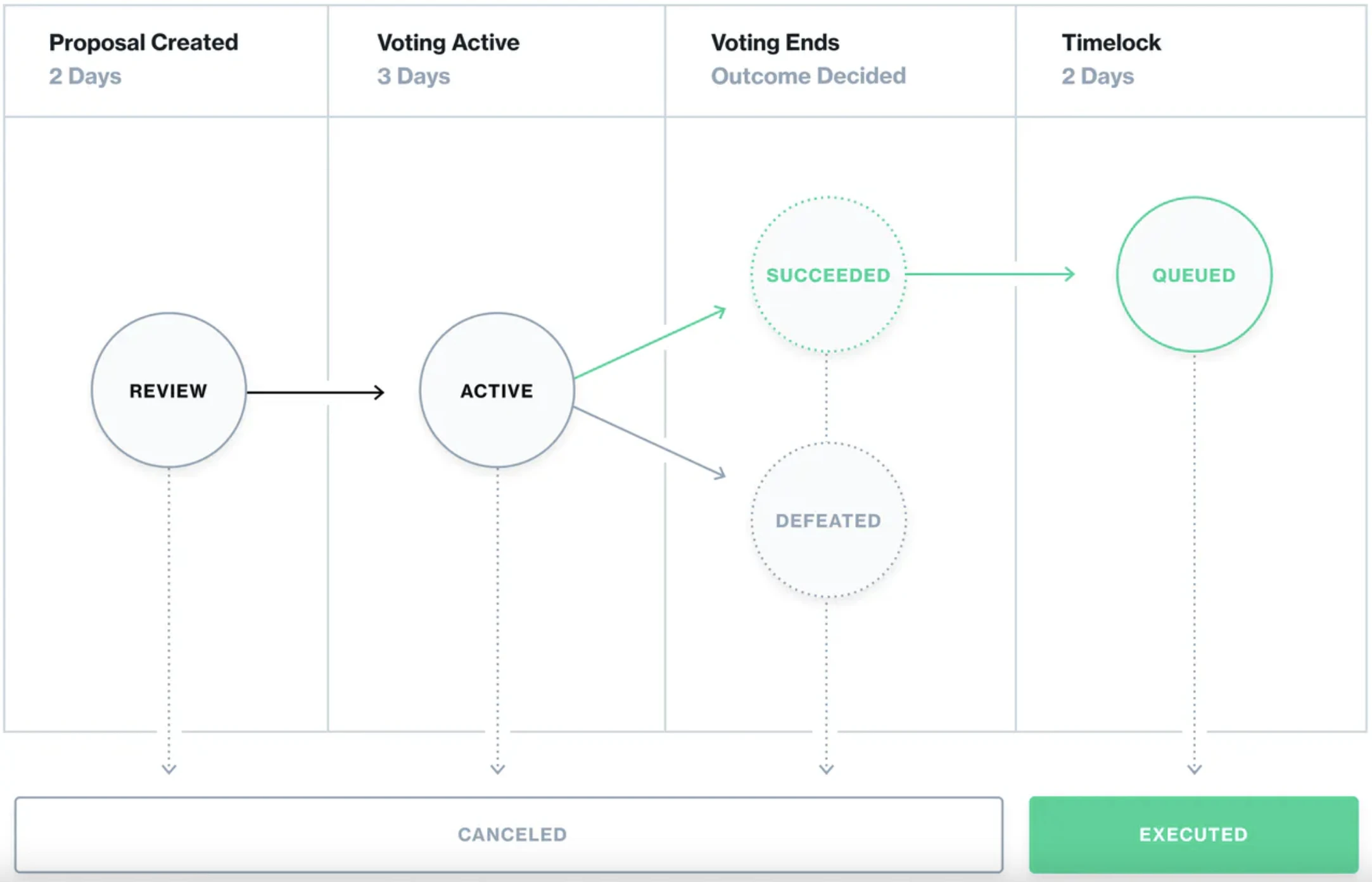 COMP 代币持有者可以将投票权委托给自己或他们选择的地址。授权至少 25, 000 个 COMP 的地址可以创建治理提案;任何地址都可以锁定 100 COMP 创建自治提案,被委托 25, 000 COMP 后成为治理提案。 治理提案创建后,将进入为期 2 天的审核期,之后记录投票权重并开始投票。投票持续 3 天;如果该提案获得多数票,且至少有 400, 000 票,则该提案将在 Timelock 中排队,并可在 2 天后实施。总的来说,对协议的任何更改至少需要一周的时间。