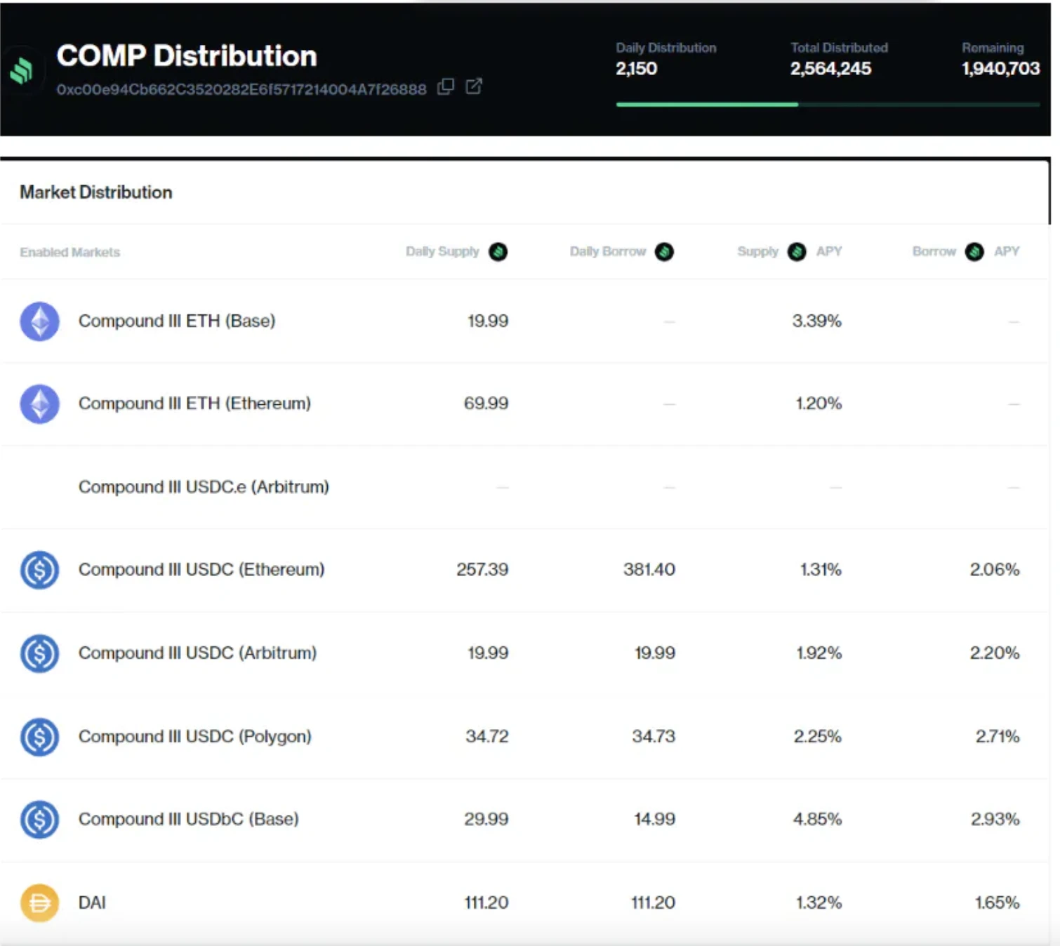 可以看到 Earn Distribution 这一块儿除了 DAI 以外均为 0% 。也就是 Compound 的代币激励促进 TVL 已经完全专注在 Compound III 上了。