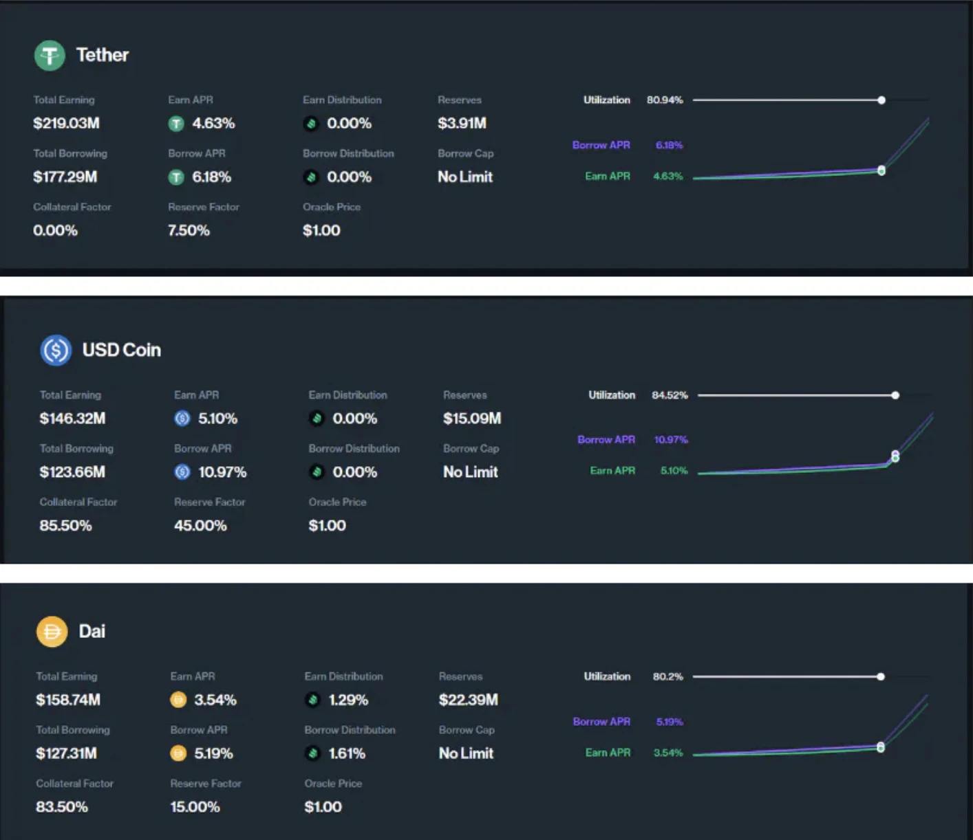 反观来看 UDSC、USDT、DAI 这些 Utilization 接近最佳利用率的则一定程度上能够判断,用户将 Eth、BTC 等抵押物兑换成了稳定币。