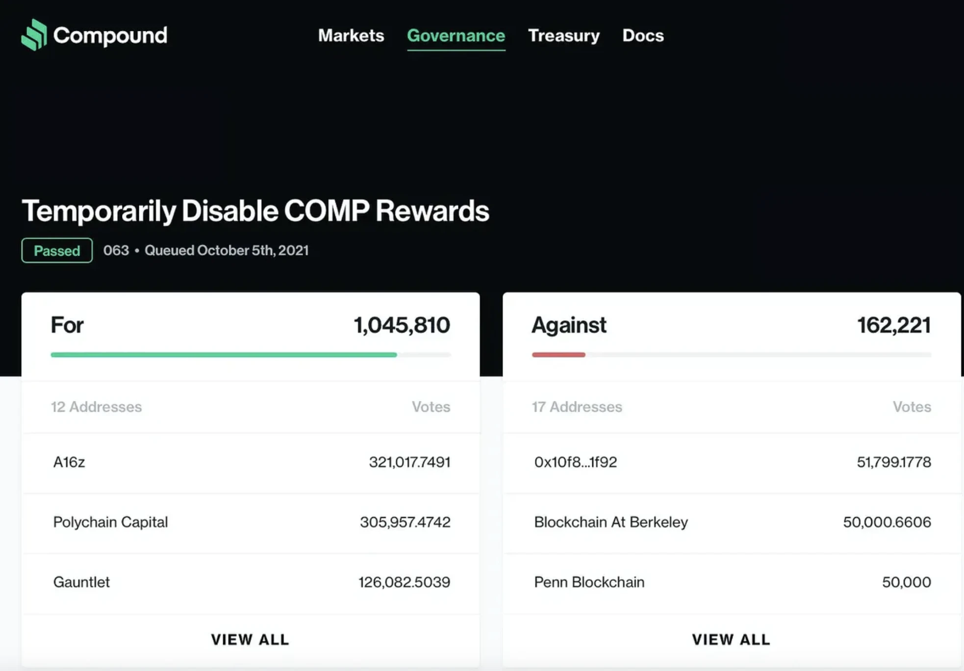该提案主要由最初提出升级方案的社区成员起草, 1037, 107 票赞成(投票者其中包括 Compound 首席执行官 Robert Leshner、a16z、Gauntlet 和 Pantera Capital 等 27 个关键地址), 0 票反对。